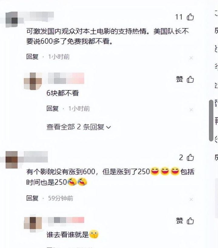 有网友提到,美队4的上映让大家对本土电影的热情再度升温。尤其是在美国排片的那段时间过后,大家似乎都心照不宣,想用同样的方式回应美国队长。就像是美国队长600的票价,免费的票也未必愿意去看呢。还有些网友分享了在网上看到的其他影院的“骚”操作,电影票价定在250元,排片时间则是两点五十。相信大家都懂250这个数字的含义吧。
