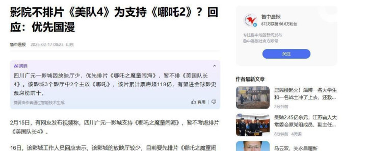 毕竟《美队4》也快在咱们这上映了,面对此种情况,咱们的影院也做了一些调整,改了排片安排。有的影院甚至明确表示不打算放《美队4》,在这种情况下,肯定得优先考虑国漫,眼下《哪吒》正处于冲刺阶段嘛。